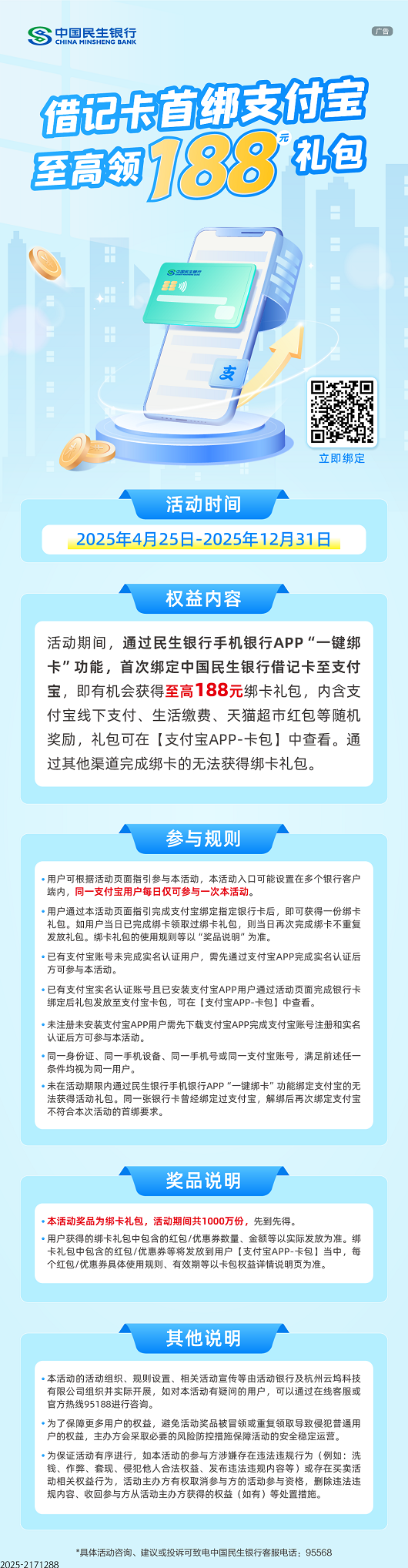 民生银行借记卡首绑支付宝 至高领188元礼包
