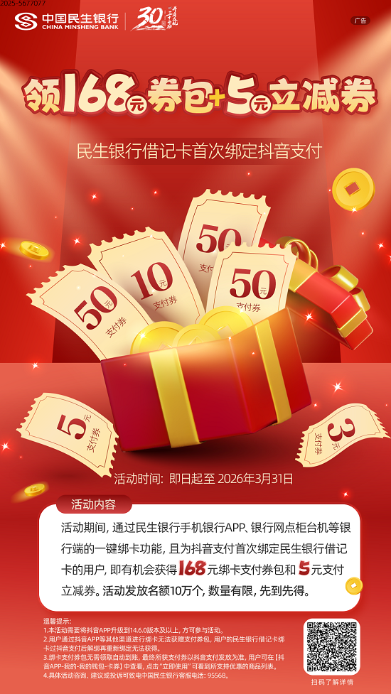民生银行借记卡首次绑定抖音支付 有机会领168元券包+5元立减券