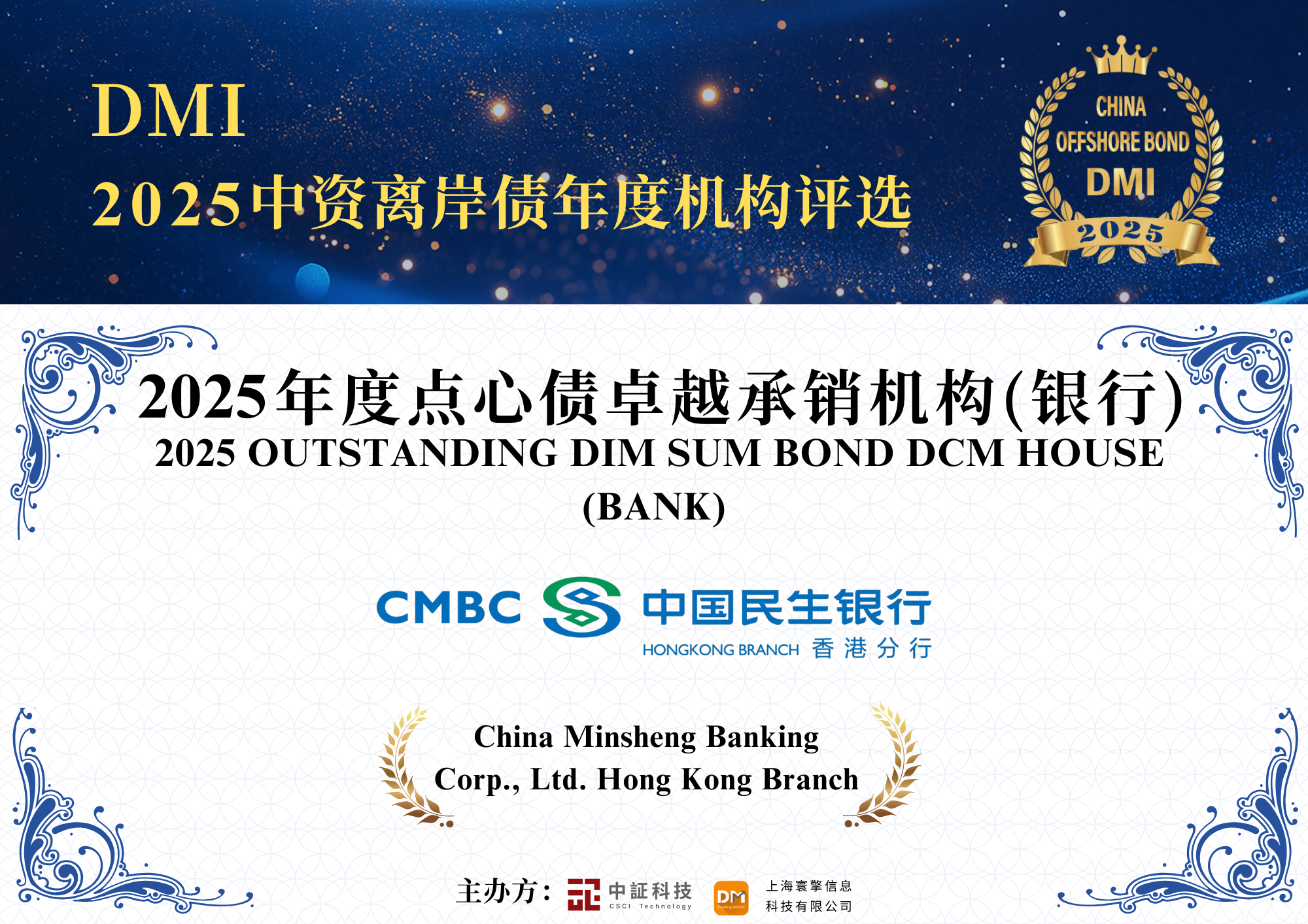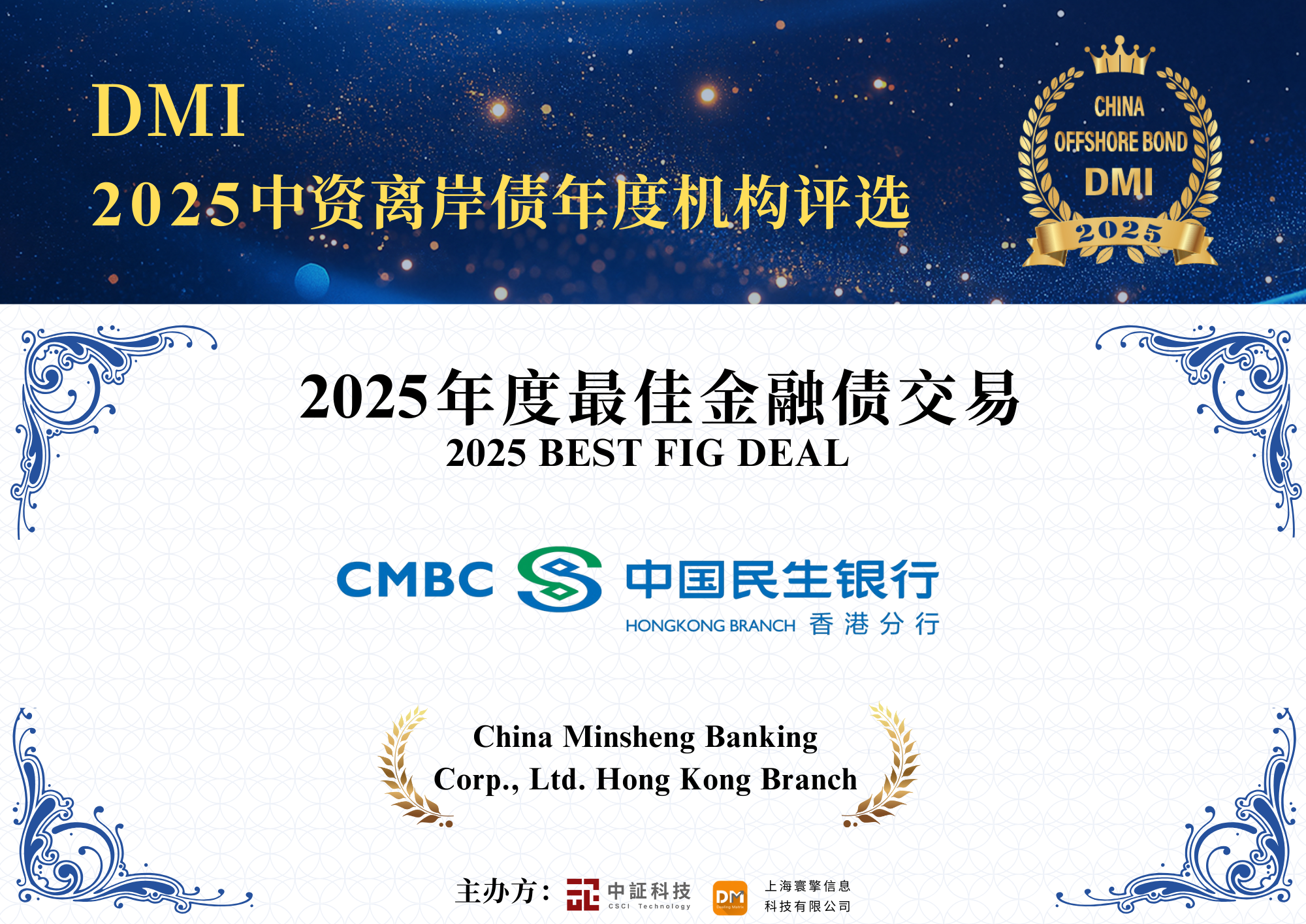 2026年2月2日,民生银行香港分行在中证信用科技有限公司(简称“中证科技DMI”)举办的2025年“DMI中资离岸债年度机构评选”中,凭借扎实的承销实力与突出的市场表现,荣获“年度ESG承销机构”、“年度点心债卓越承销机构(银行)”两项机构大奖;同时,民生银行香港分行参与的两项标杆性交易获评“年度最佳金融债交易”,充分体现了民生银行香港分行在离岸债券业务上的综合实力与行业认可。